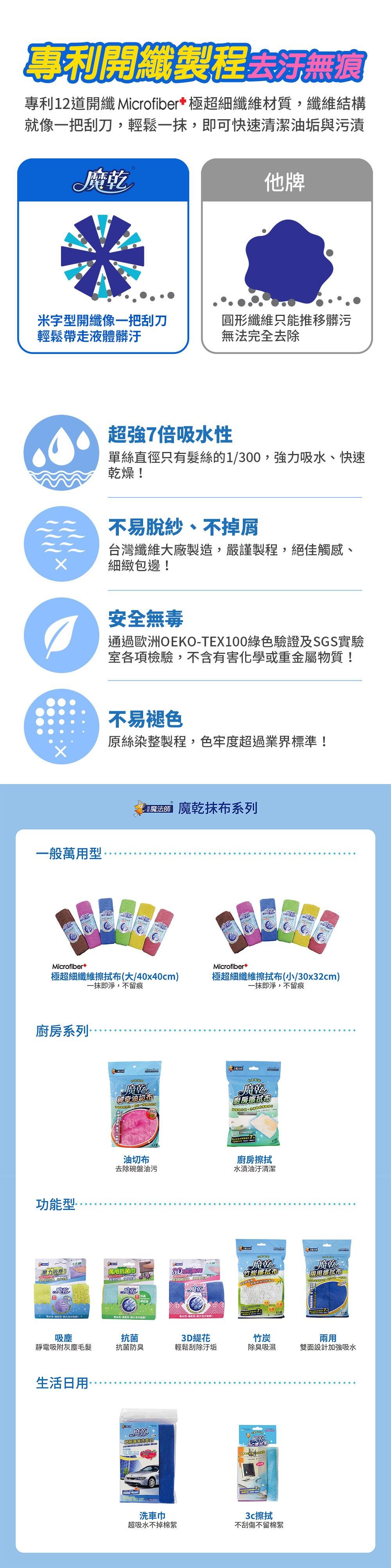 - 专利12道开纤MicroFiber+极超细纤维材质,提供效果显著之去污、除垢、吸水及不掉屑特性,完全不同于市售劣质全聚酯纤维商品.