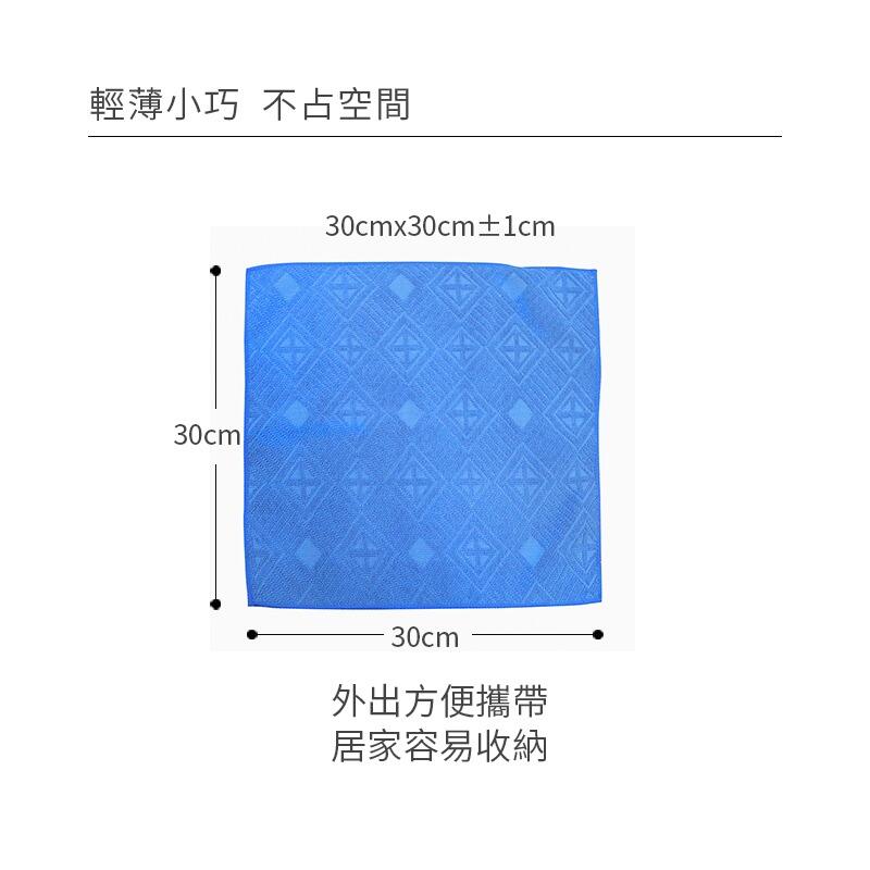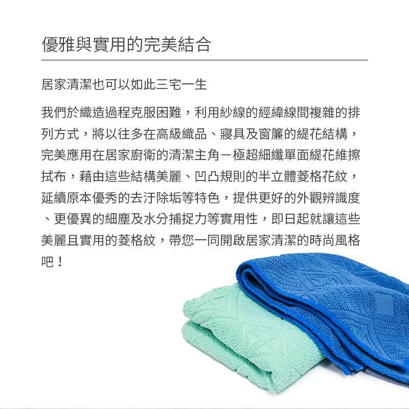 双面织法,美观的凹凸立体菱格纹,更容易将灰尘、水渍刮除,专利技术纤维直径只有发丝3百分之1,去污效果显著,超强7倍吸水力,高色牢度,不易退色、不掉屑,经SGS及欧洲绿色验证,不含有害化学重金属