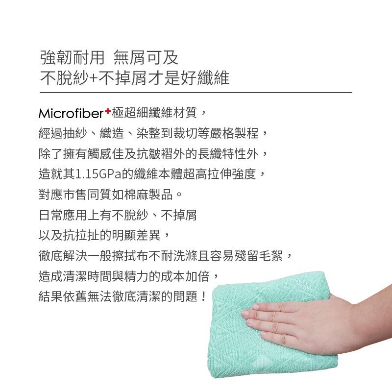 - MicroFiber+极超细纤维材质经严谨制程,以绝佳触感以及不易脱纱、不会掉屑且抗拉扯的长纤维特性,可满足长年或重度使用的环境.