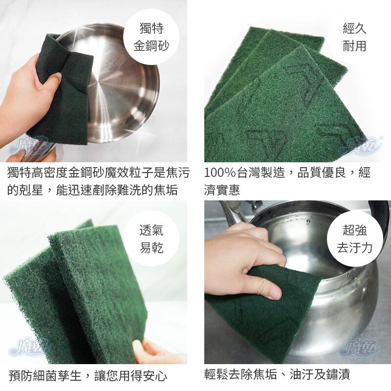 - 我们藉由混纺金刚砂与尼龙纤维的特殊制程,创造出高密度金刚砂魔效材质,针对最令人头痛且顽强的锅具油污及污渍,在避免直接伤害金属锅具表面的前提下,提供彻底去除的最佳解决方案.
